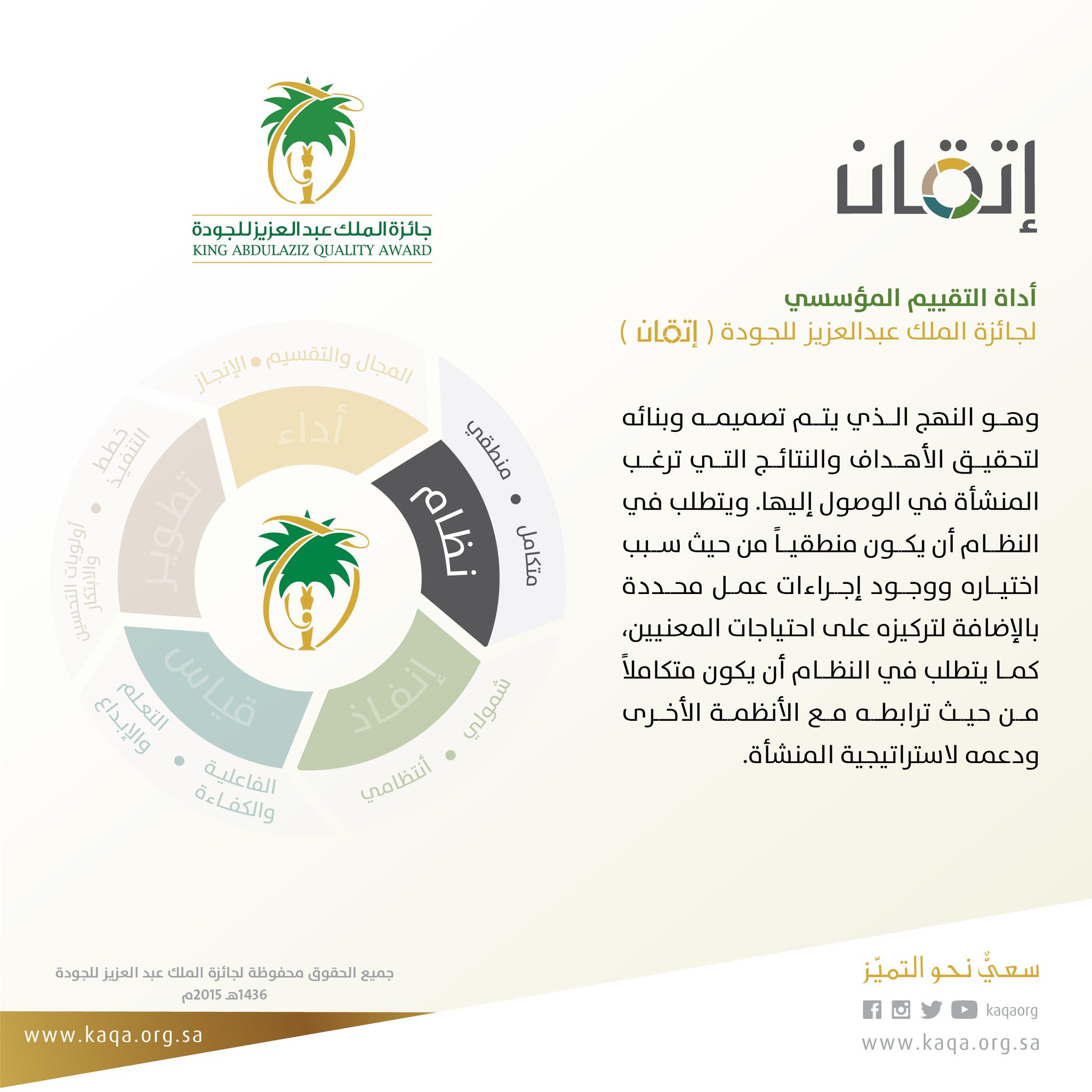 جائزة الملك عبدالعزيز للجودة Twitterren العنصر الثاني من أداة التقييم المؤسسي إتقان نظام وهو أول عنصر لتقييم معايير الممكنات